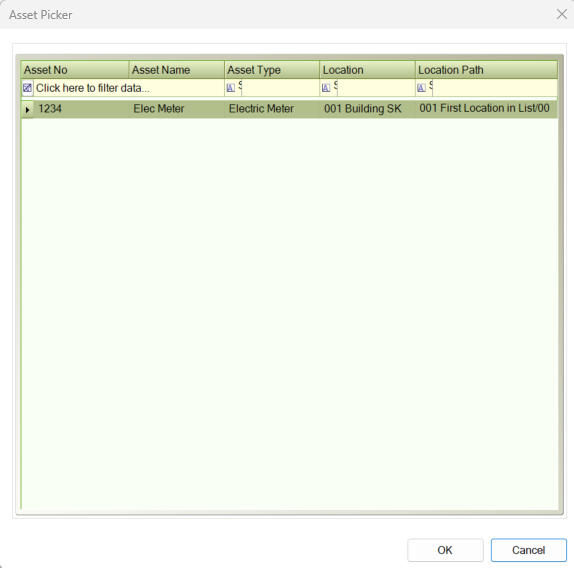 The Asset Picker window is displayed and will contain all assets linked to the supplier selected on the invoice.