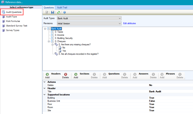 Use this reference data to define the questions to be used during an audit. The questions are split into headers, sections, questions, answers and phrases.