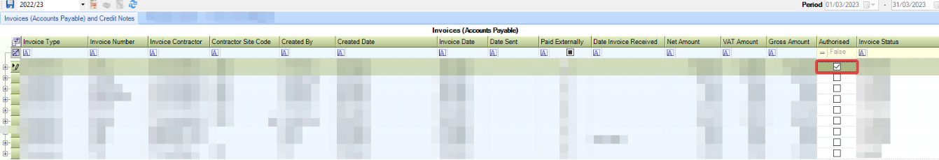 All unauthorised Invoices (Accounts Payable) and Credit Notes are displayed on the period defined.