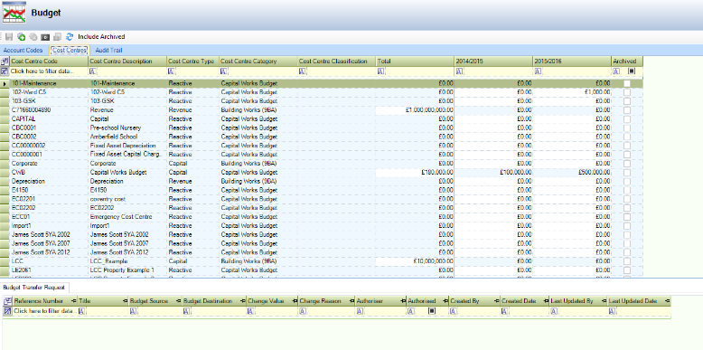 The Cost Centres tab displays all relevant cost centre codes within the grid.