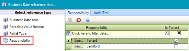 The Business Rate reference data window can be accessed by navigating to Estates > Business Rate > Business Rate.