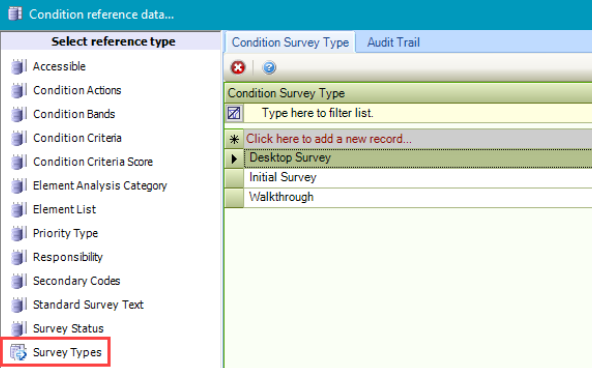 The Condition reference data window can be accessed by navigating to Maintenance > Condition > Condition.