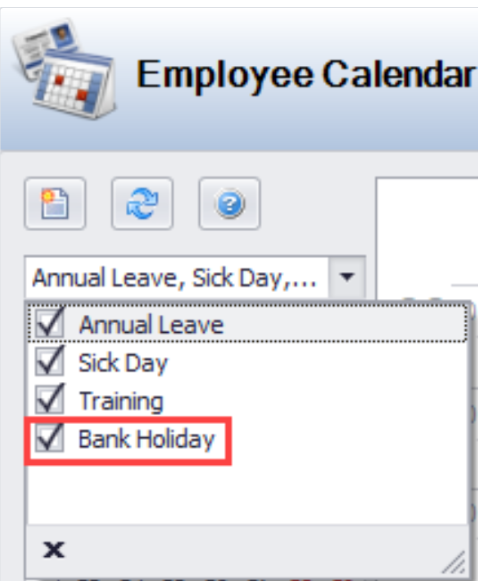 These are displayed in the Employee Calendar (provided the Bank Holiday check box is selected in the top drop-down list).