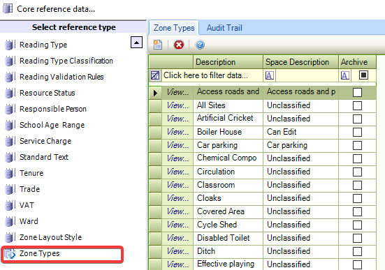 Use this reference data to define types of zones (for example: car parks, grass pitches, and so on).