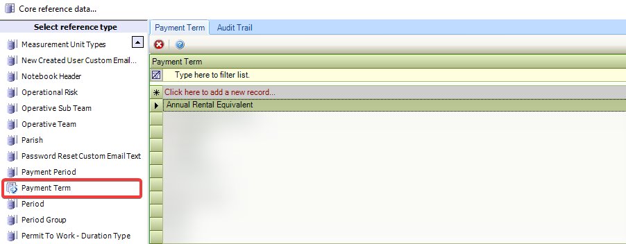 Use this reference data to define payment terms (for example: In Advance, In Arrears, On Completion).