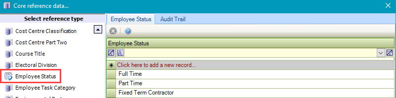 Use this reference data to specify employee statuses (for example: fixed-term contractor, full-time, part-time and so on).