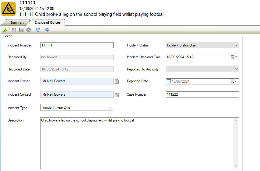 Recorded By | The user who recorded the incident. This is populated automatically with the logged-in user's username and cannot be edited. |