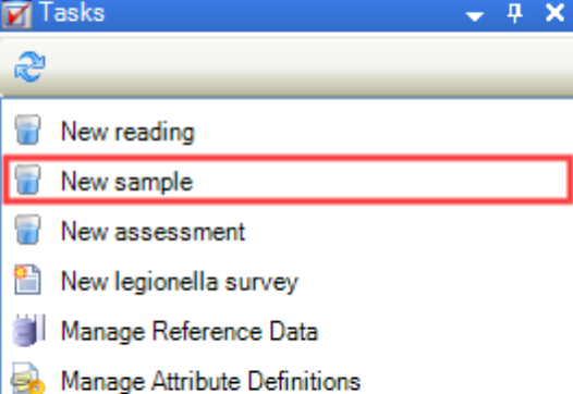 Click the New sample button in the Tasks panel of a Legionella Survey record or search for and open the relevant Legionella Survey.