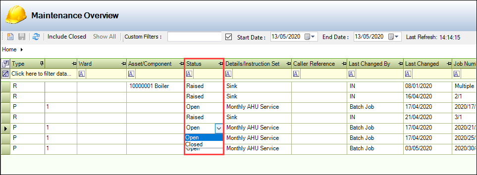 The Maintenance Overview is used to manage and update Service Requests Maintenance and PPM (planned preventative maintenance) Active Tasks relating to the business units that you have permissions to view.