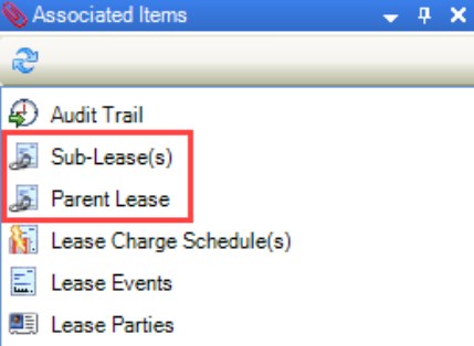 The linked leases can then be viewed by clicking the Sub-Lease(s) or Parent Lease option in the Associated Items panel.