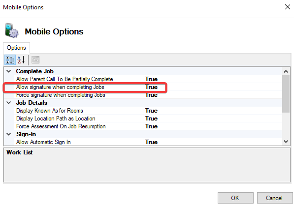 Allow signature when completing jobs. | When True, a signature can be input during job completion. ![]() ![]() |
