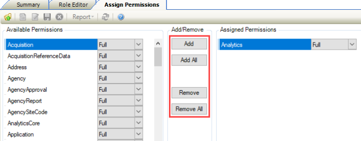 Select the permission and use the Add, Add All, Remove, and Remove All buttons to assign the permissions to the role.