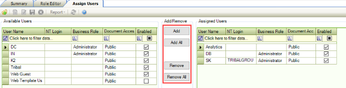 Select the user and use the Add, Add All, Remove, and Remove All buttons to assign the users to the role.