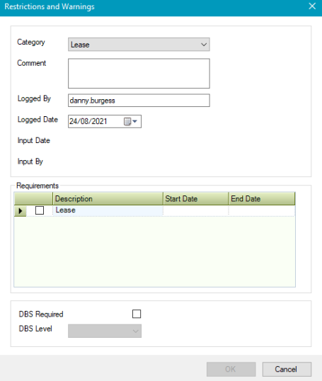 Input By | The user who input the restriction or warning. This defaults to the logged-in user and cannot be amended. |