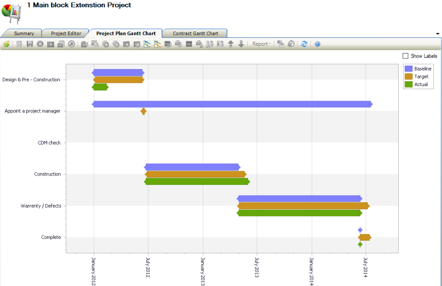 You can use the Contract Gantt Chart screen to view the target and actual dates of contract events.