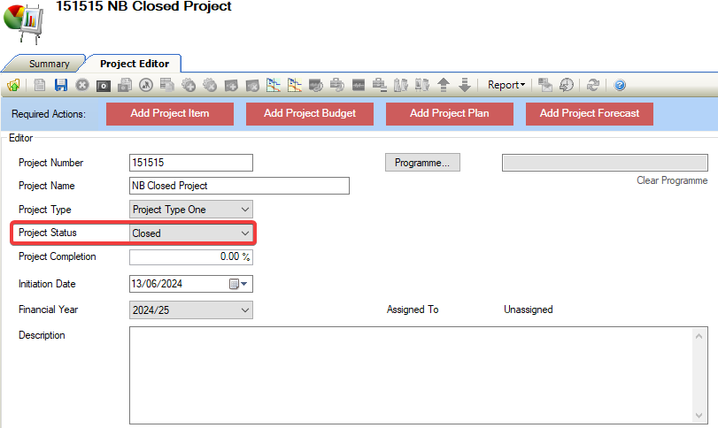 Project Status | The project status. These can be defined in Project Status Reference Data (accessed by navigating to Maintenance > Projects > Projects). |
