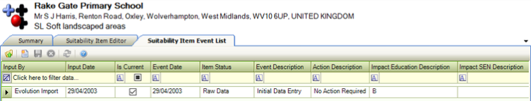 General suitability information is stored at the business unit (school) level with individual suitability items stored at the room or zone level.