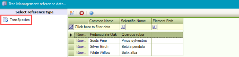 The Tree Management reference data window can be accessed by navigating to Functions > Tree Management > Tree, or by clicking Manage Reference Data in the Tasks panel of a Tree record.