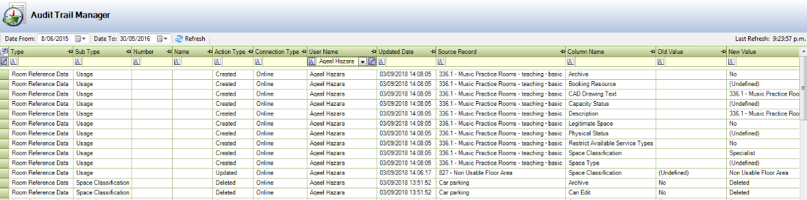 The Audit Trail Manager (accessed by navigating to Tools > Audit Trail Manager) allows a system administrator to view all of the changes that have been made in K2. The results are returned in a grid so that the module, user, date, field, old and new value can be filtered.