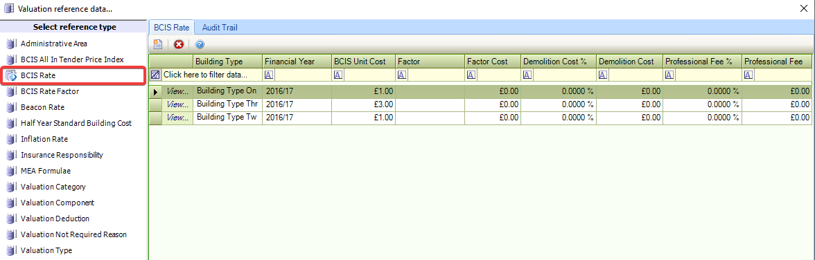 The Valuation reference data window can be accessed by navigating to Estates > Valuation > Valuation, or by clicking Manage Reference Data in the Tasks panel of a Valuation record.
