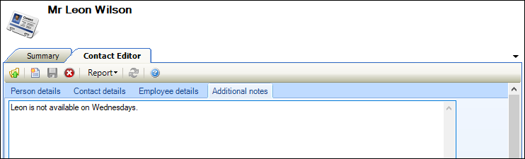Use this tab to record any additional information about the contact (for example: hours of availability).
