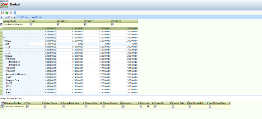Account codes, Cost Centres, Audit Trail | Add a financial year to the grid. |