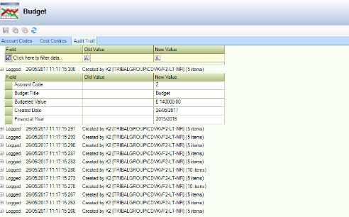 Account codes, Cost Centres, Audit Trail | Deletes the relevant financial year from the grid. |