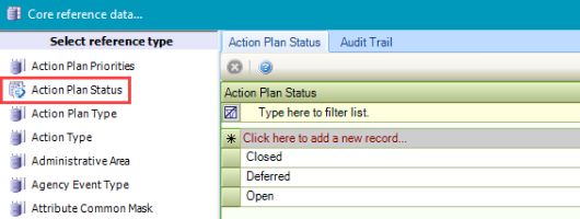 Use this reference data to define the current status of an action plan (for example: Closed, In progress, Deferred).