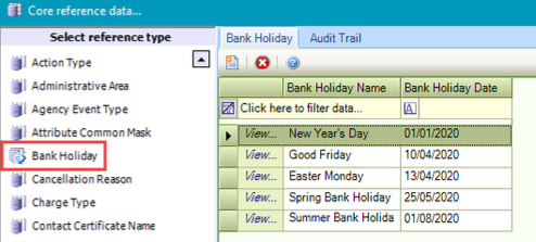 Use this reference data to record bank holidays.