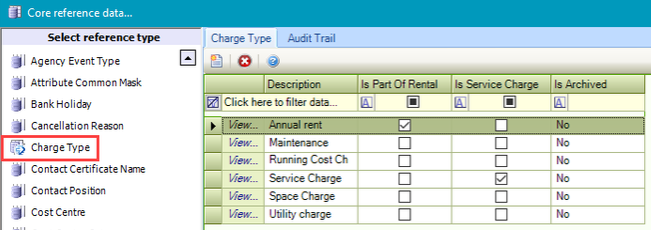 Use this reference data to define charge types (for example: parking, security, catering and so on).