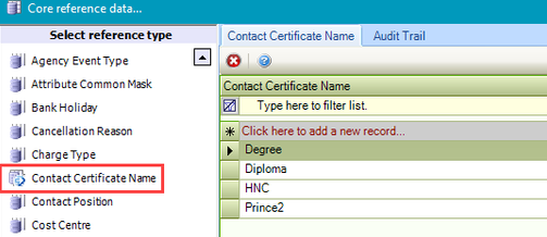 Use this reference data to record names of certificates that can be recorded against contacts (for example: diploma, HNC and so on).