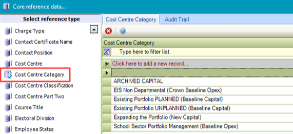 Use this reference data to define cost centre categories (for example: IT, cleaning, taxi bookings and so on).