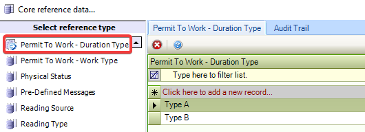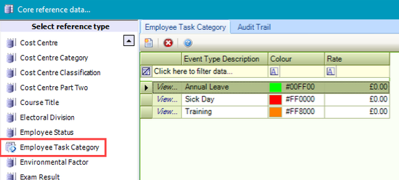 Use this reference data to define categories of employee tasks (for example: Annual Leave, Sick Days, and Training Days). This is used when adding an event to the Employee Calendar.