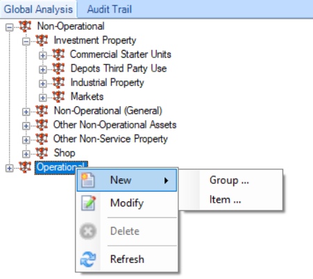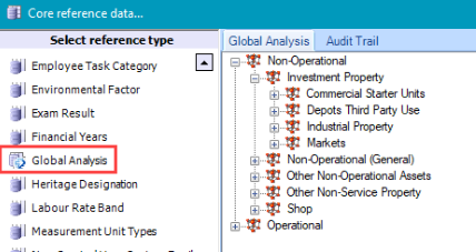 Global analysis can be linked to Buildings and Sites. It is a reporting option that allows you to create a hierarchy and then link in buildings and sites based on the type of building or site service delivery. It allows you to report on the number of warehouses, land used for car parking, and so on.