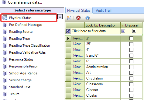 Use this reference data to define the physical status of entities (for example: In Use, In Disposal Process, and so on).