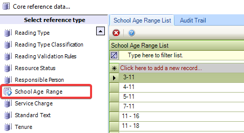 To add a new School Age Range List, enter text into the * field.