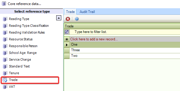 To add a new trade, enter text into the * Click here to add a new record… field.