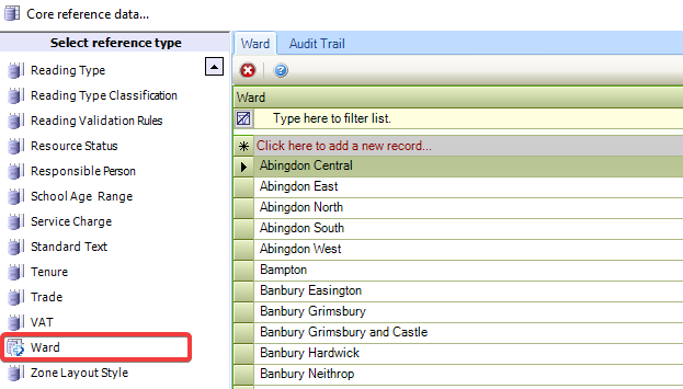 To add a new ward, enter text into the * Click here to add a new record… field.