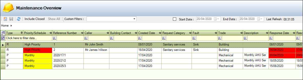 The Maintenance Overview is used to manage and update Service Requests Maintenance and PPM (planned preventative maintenance) Active Tasks relating to the business units that you have permissions to view.