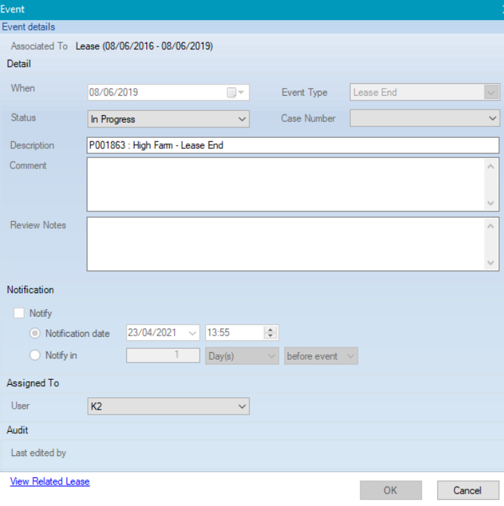 Event Type | The type of event These can be defined in Lease Event Type Reference Data (accessed by navigating to Estates > Estates > Lease). |
