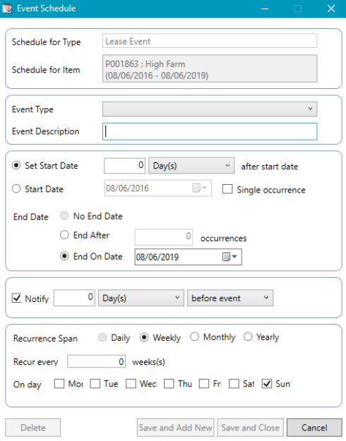 Event Type | The type of event. These can be defined in Lease Event Type Reference Data (accessed by navigating to Estates > Estates > Lease). |