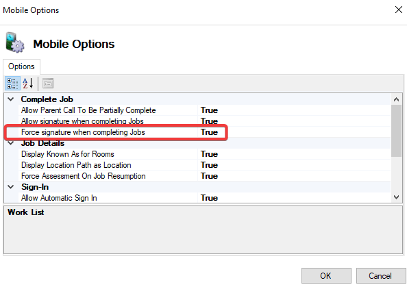 Allow signature when completing jobs. | When True, a signature can be input during job completion. ![]() ![]() |