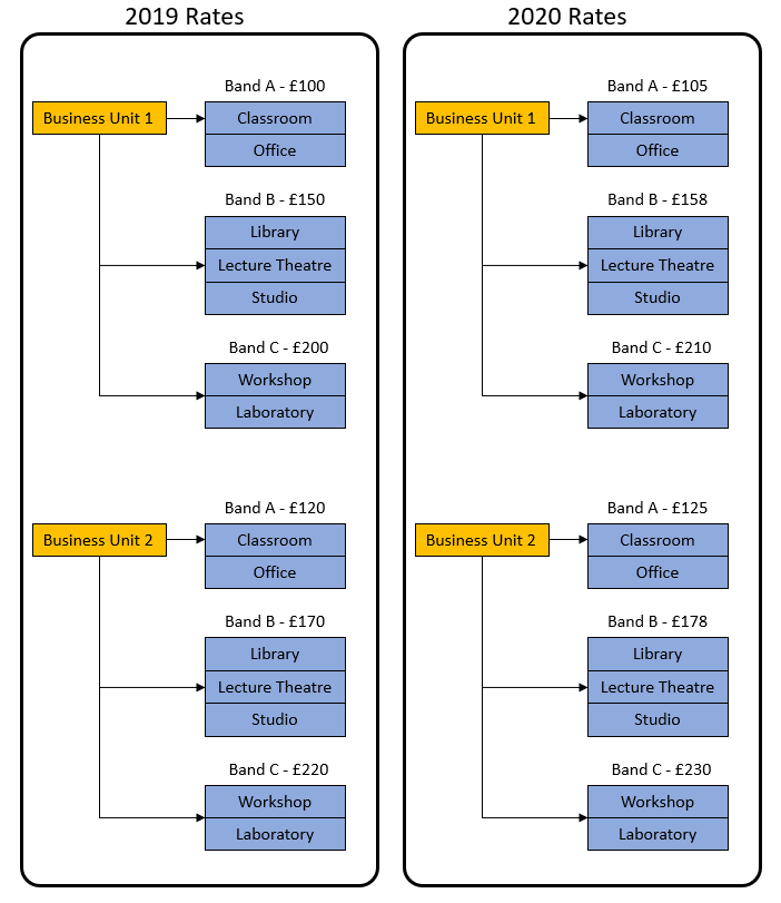 Room usage such as classrooms and offices is assigned to a band. When the band is assigned to the business unit it is given a rate which is used in the calculation for on-charging. Different rates are used for different business units. Each financial year a new set of rates is defined for each business unit.