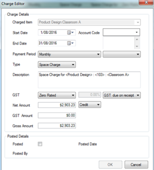 The Charge Editor is displayed. All of the details on the charge record are auto-populated when the record is created, except the 'Posted Details' section, which can be populated by an interface when the records are sent to a third-party system.