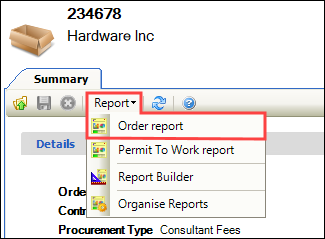 Select Order report from the Report drop-down on the Order Editor.