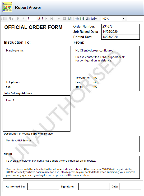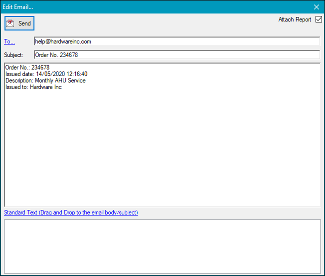 The order report can be emailed to a contractor directly from K2, provided that the contractor has a valid email address in the Contact Details section on the Agency Editor. Refer to Adding or Editing an Agency for further information.