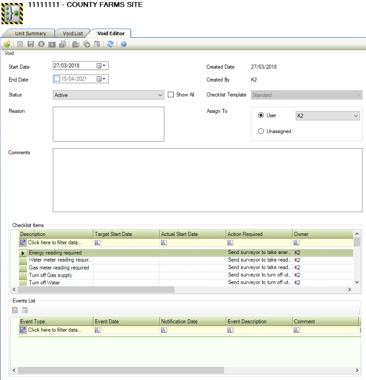 A void record contains checklist items created from the checklist template which can be managed in Units Reference Data. A list of events can be added against a void and displayed in the Calendar.