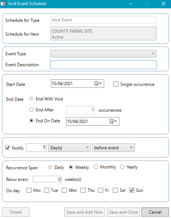 Schedule for Type | This defaults to 'Void Event' and cannot be edited. |