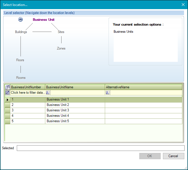 Use the level selector to select the relevant room, floor, zone, building, site or business unit. |