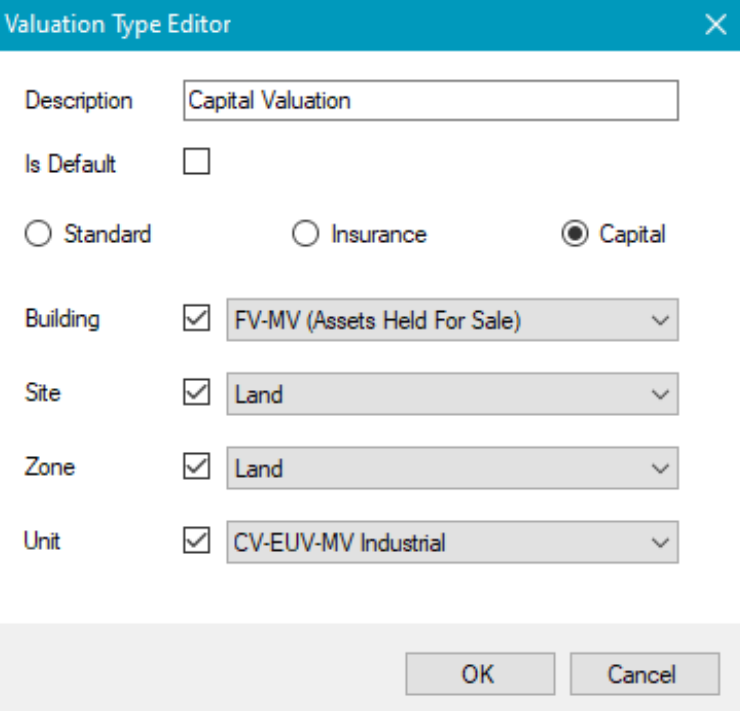 The Valuation reference data window can be accessed by navigating to Estates > Valuation > Valuation, or by clicking Manage Reference Data in the Tasks panel of a Valuation record.